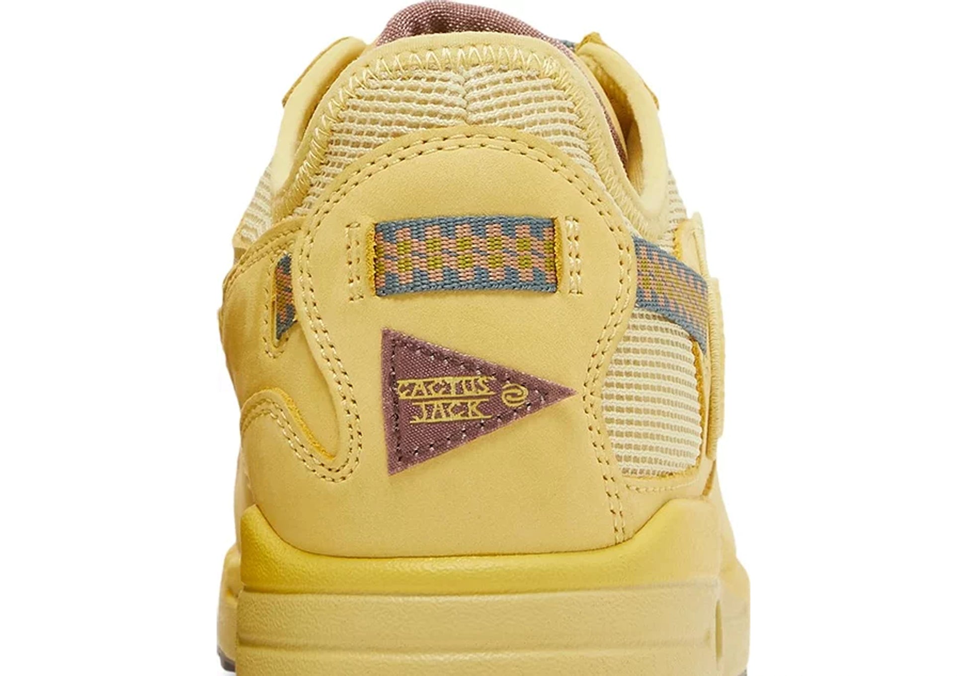 Das Obermaterial des Schuhs ist in einem auffälligen Saturn-Gold-Ton gehalten, der durch kontrastierende Akzente und Details wie das gestickte Cactus Jack-Logo auf der Ferse und die charakteristische Swoosh-Grafik auf der Seite des Schuhs akzentuiert wird.